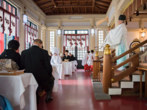 修祓、玉串奉奠と三々九度、神前式ならではの挙式でお二人のお幸せを末永くお祈りいたします。